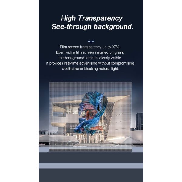 As a transparent display, the flexible LED transparent film screen boasts exceptional transparency, reaching up to 97%. This characteristic ensures that even with the film screen mounted on glass, the content behind remains clearly visible. While showcasing advertisements, the transparent film screen preserves the original environmental view and does not impede the glass's natural lighting and light transmission, maintaining the space's openness and visual permeability.